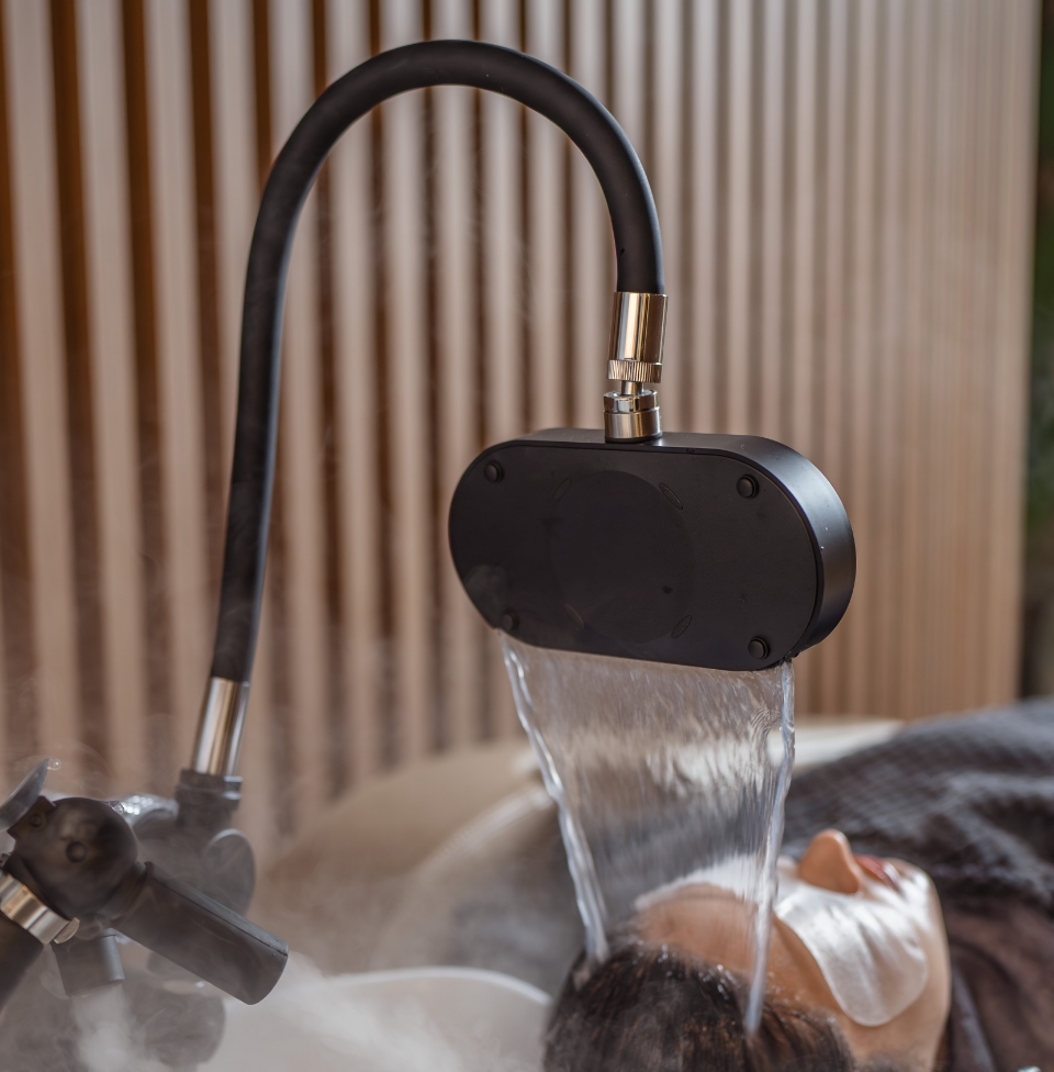 Using the principle of a waterfall, ultrafine water droplets are dispersed, generating negative ions that effectively eliminate toxins built up on the scalp. This process stimulates blood circulation, soothes irritated scalp, and provides abundant hydration—relieving tension and reducing stress to deliver a deeply relaxing and healing experience.